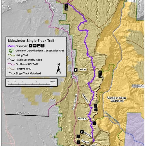 Sidewinder Trail dips, rolls, and traverses the western slope of a long ridge that divides the wide Uncompahgre Valley from the Gunnison River as it rushes through the 14-mile-long Gunnison Gorge on the east side of the ridge. The entire area, protected in the 62,844-acre Gunnison Gorge National Conservation Area, is a playground not only for mountain bikers but also rafters, kayakers, and fishermen. Much of the Sidewinder Trail features rocky slopes in high-desert terrain.